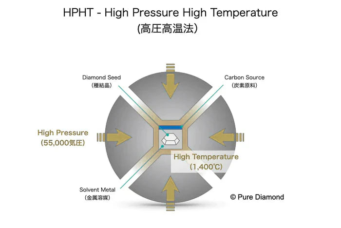 最も研究が古く現在で広く普及している方式がHPHT(高圧高温度法)と呼ばれるものです。天然ダイヤモンドは地中深くのマントル内で生成されますが、それに近い環境を人工的に作り出しダイヤモンドを生成するというものです。55000気圧ほどの圧力と1400℃以上の高温の両方を必要とします。