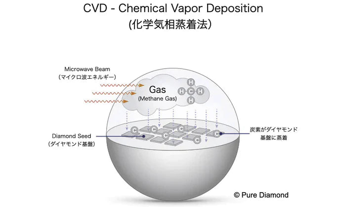 CVD(化学気相蒸着法)は高品質な比較的大粒のダイヤモンドの生成に適した方法です。生成温度は比較的高く800 - 1300℃ですが、高い圧力は必要としません。