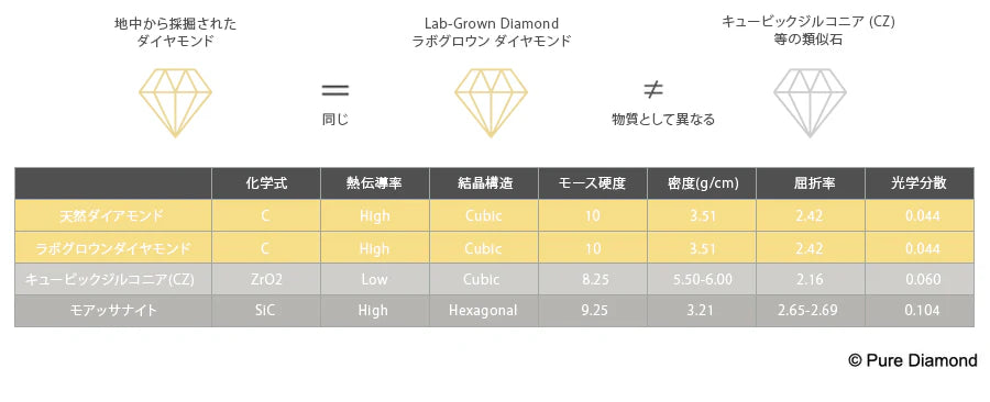 ラボ グロウン ダイヤモンド (Lab-Grown Diamond) は、地球上で生成されたダイヤモンドです。いわゆる[模造石・類似石]と呼ばれるダイヤモンド代替石(キュービックジルコニア、モアッサナイト、クリスタル等)とは全く異なり、鉱山で採掘された天然ダイヤモンドと同じ科学的、物理的、光学的性質を持つ同じ物質です。ラボ グロウン ダイヤモンドと天然ダイヤモンドは同じ原料からできています。唯一の相違点は生成された環境です。